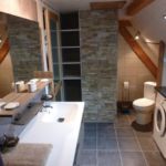 La salle de bain adéquate avec wc dispose d’une grande cabine de douche. Vous y trouverez aussi le lave-linge. Nous mettons des serviettes de bain à votre disposition.